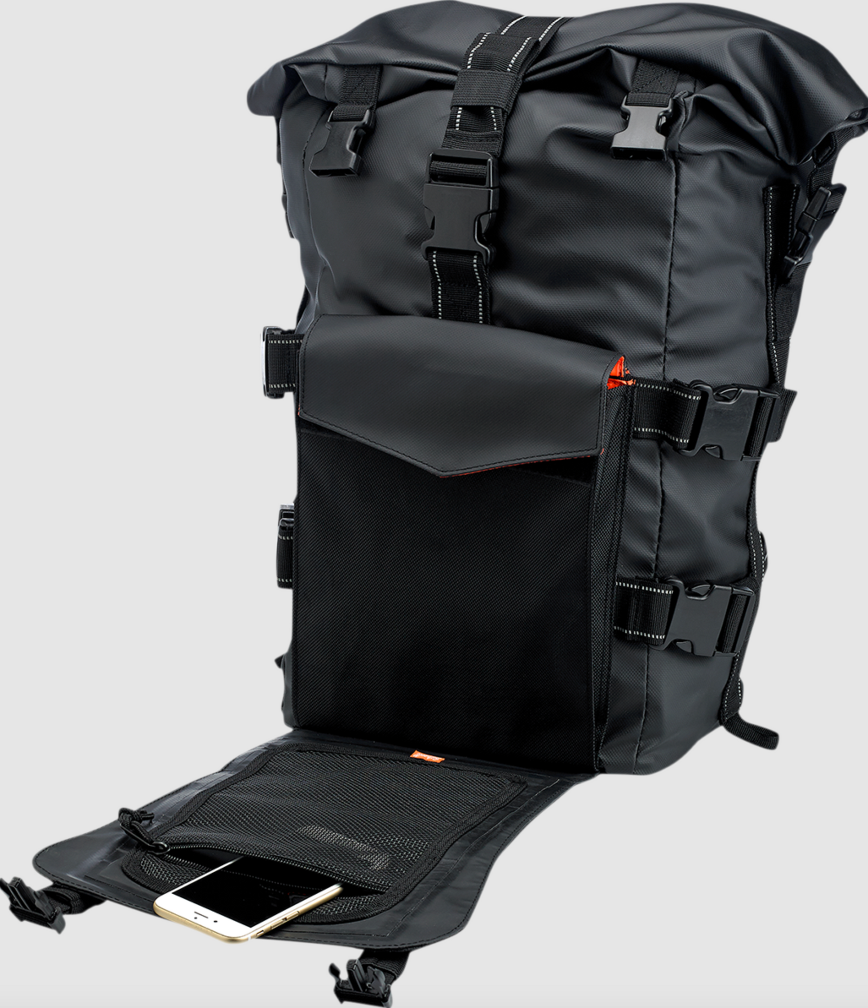 Roll-top closure with reinforced nylon quick-release buckles keeps contents sealed tight