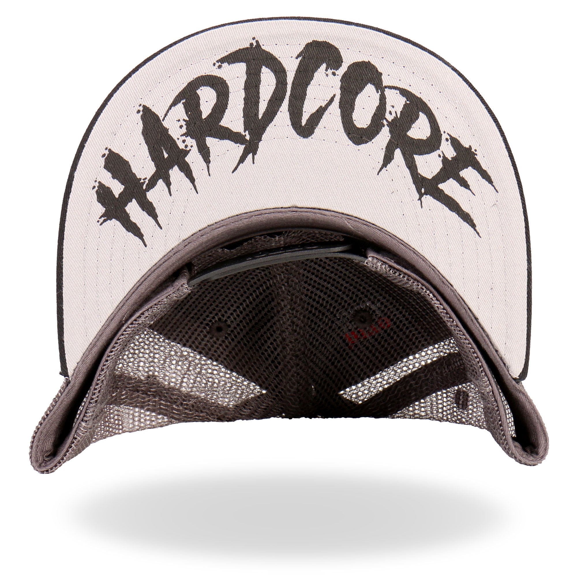 The front panel has a sewn on set of white brass knuckles patch and the underside of the bill is a light grey displaying the text "HARDCORE" in dark black.