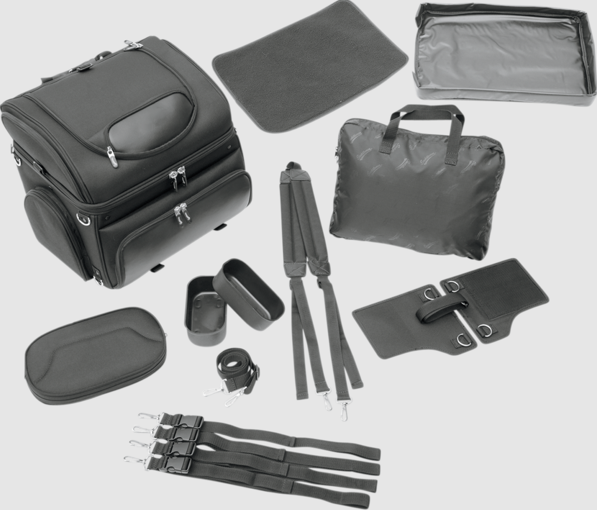 Versatile mounting system installs on luggage rack, back seat or sissy bar; clips onto most BREND_5 touring bags
